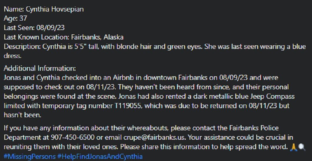 Regarding the missing person’s case, Cynthia and Jonas stayed at an Airbnb in downtown Fairbanks the day they disappeared.